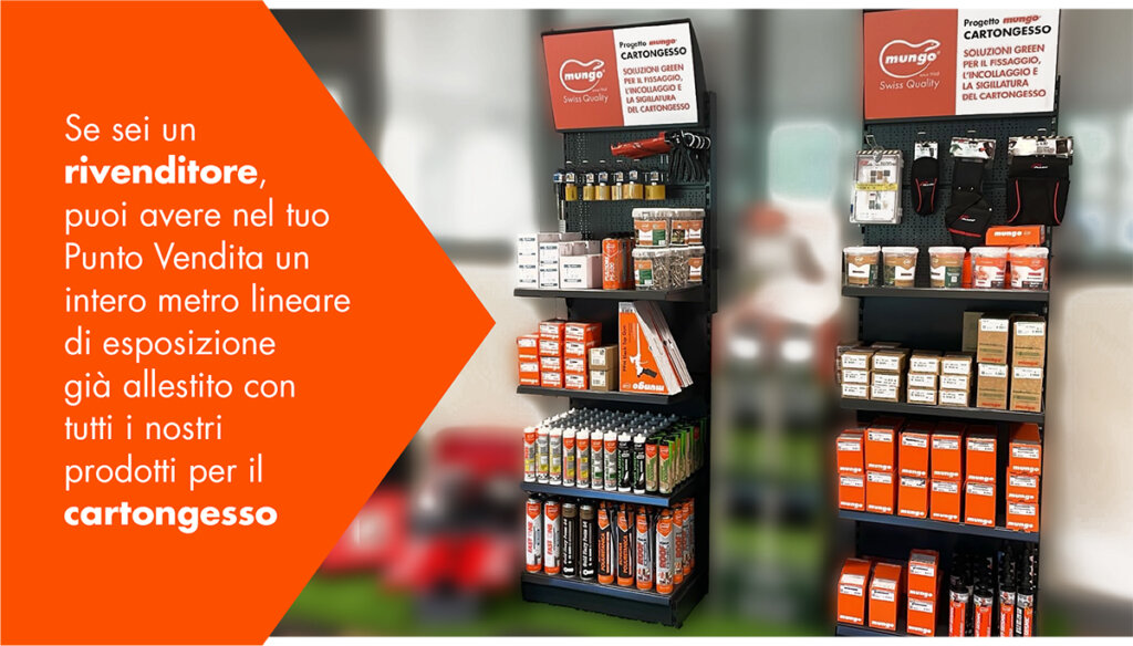mungo Italia presenta un’intera gamma di prodotti di fissaggio specificamente progettati per sposare ed esaltare le caratteristiche peculiari del cartongesso. Viti speciali per il fissaggio delle lastre ai profili, tasselli a battuta in nylon, metallo e fibra di vetro, sigillanti, adesivi e schiume.